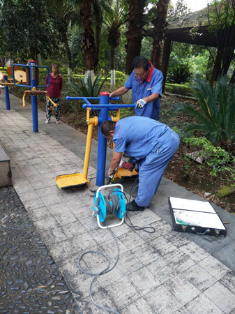 耀和荣裕项目维修工(gōng)在儿童游乐场整改安全隐患。