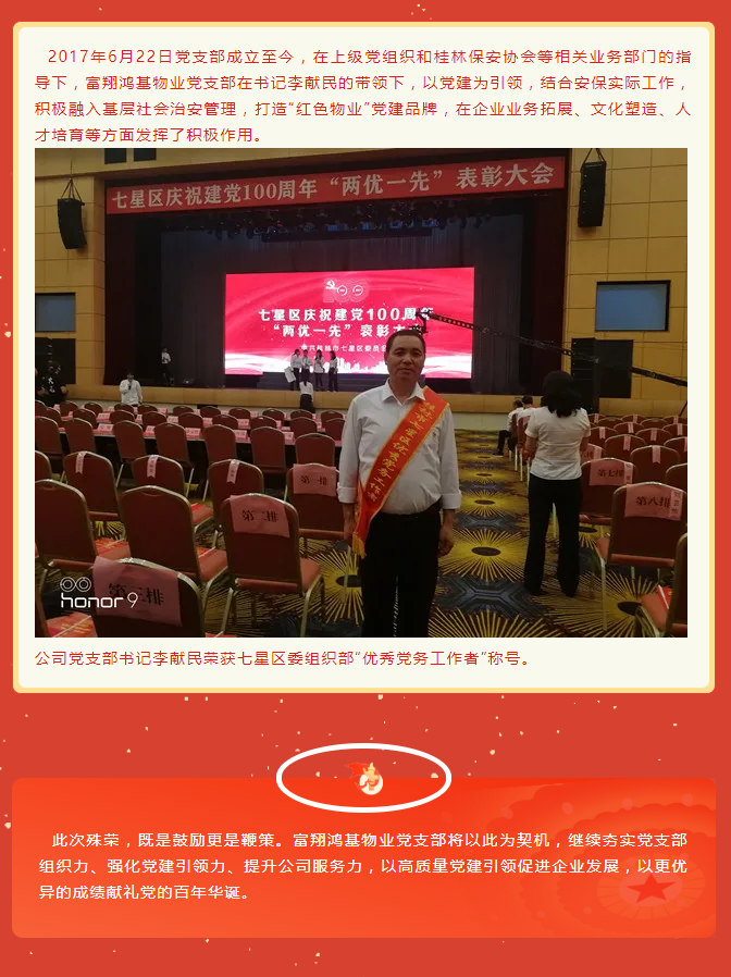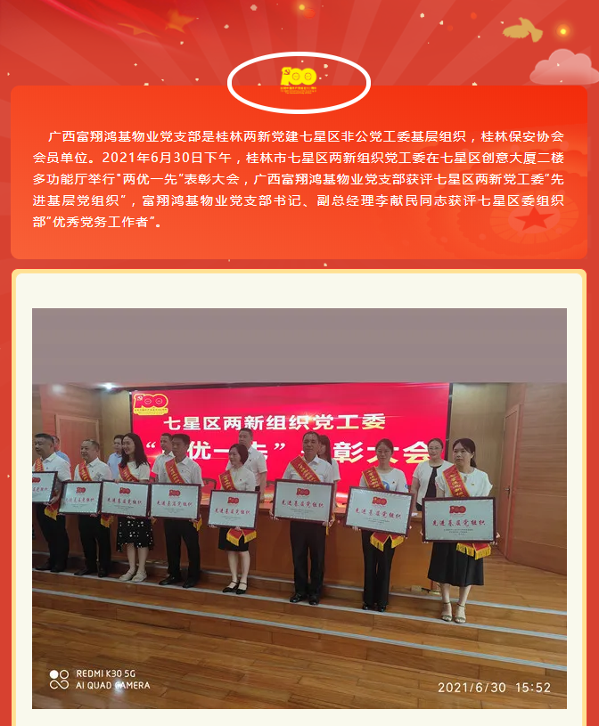广西富翔鸿基物业党支部荣获七星区两新党工(gōng)委“先进基层党组织”