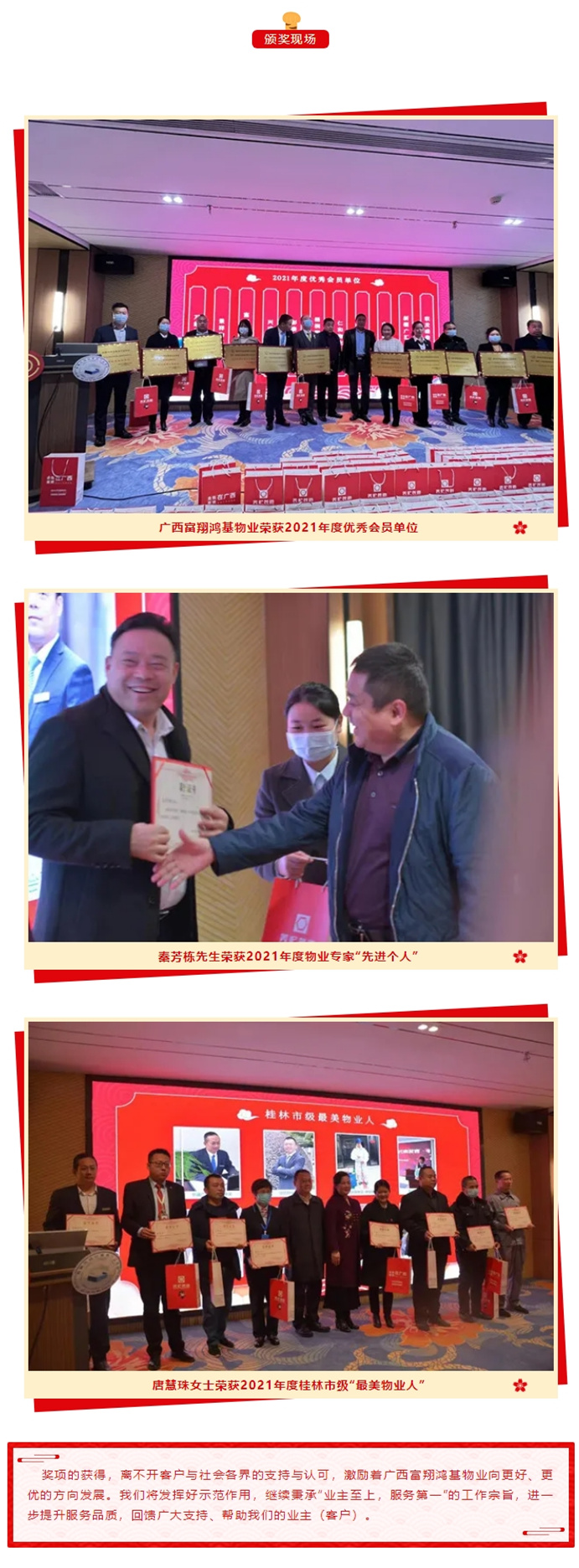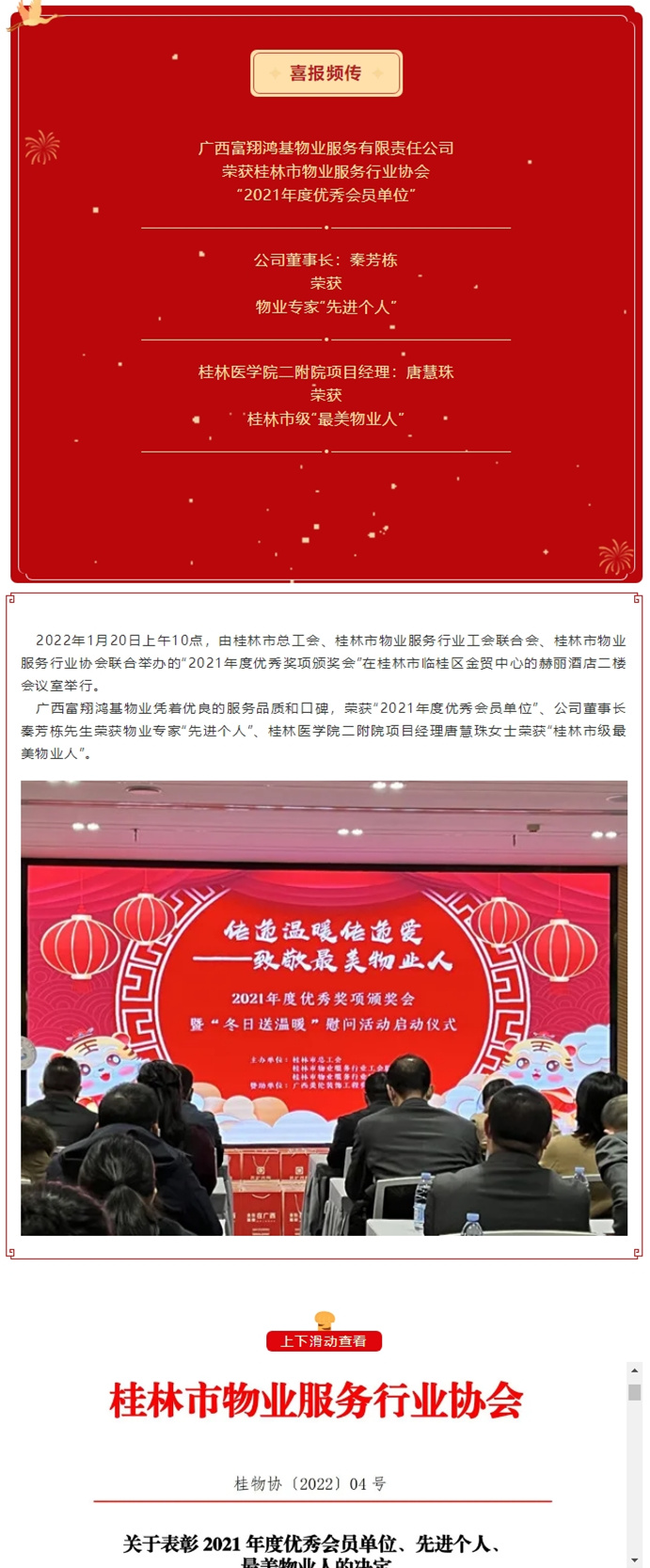 > 喜报频传|广西富翔鸿基物业荣获桂林(lín)市物业协冷醫會(huì)优秀會(huì)员单位等多项荣誉